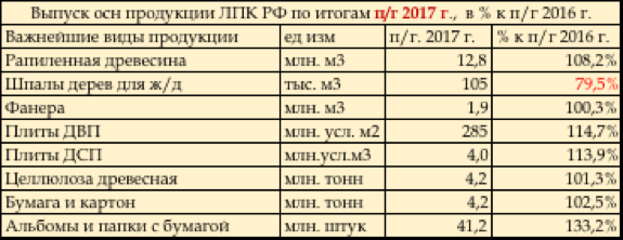 Объёмы производства основной продукции деревообрабатывающей и целлюлозно-бумажной отраслей России по итогам полугодия 2017 года представлены в таблице. Данные таблицы основаны на оперативной статистической информации Росстата.